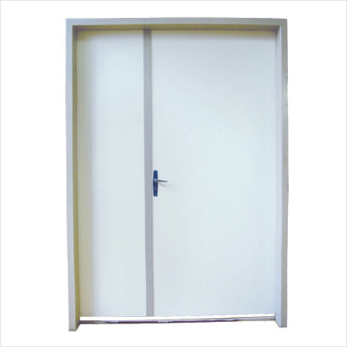 Porta radiológica dupla montada em batentes de aço liga 1010/1020 tratado com pintura eletrostática, dobradiças especiais tipo gonzo, fechadura de tambor auto-blocante, acabamento em fórmica 2040x2100mm 2,0mm PB.